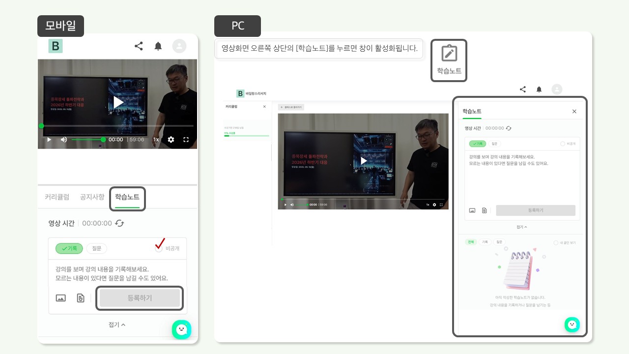 커리큘럼 영상 재생 시 [학습노트]를 이용해 강의 내용을 기록하실 수 있습니다.