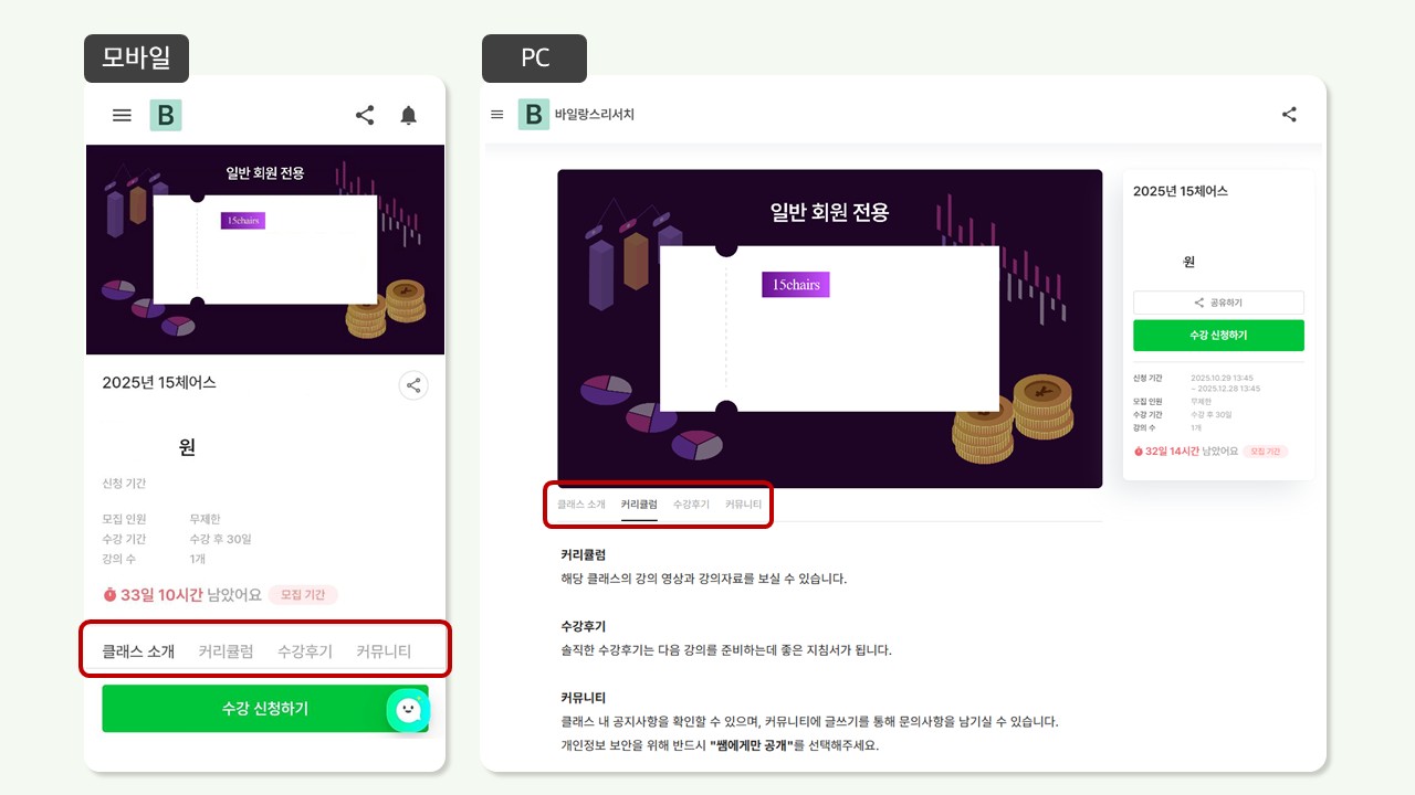 15체어스 수강 신청 후 추후 방송일자가 확정되면 본 강의를 들을 수 있습니다.