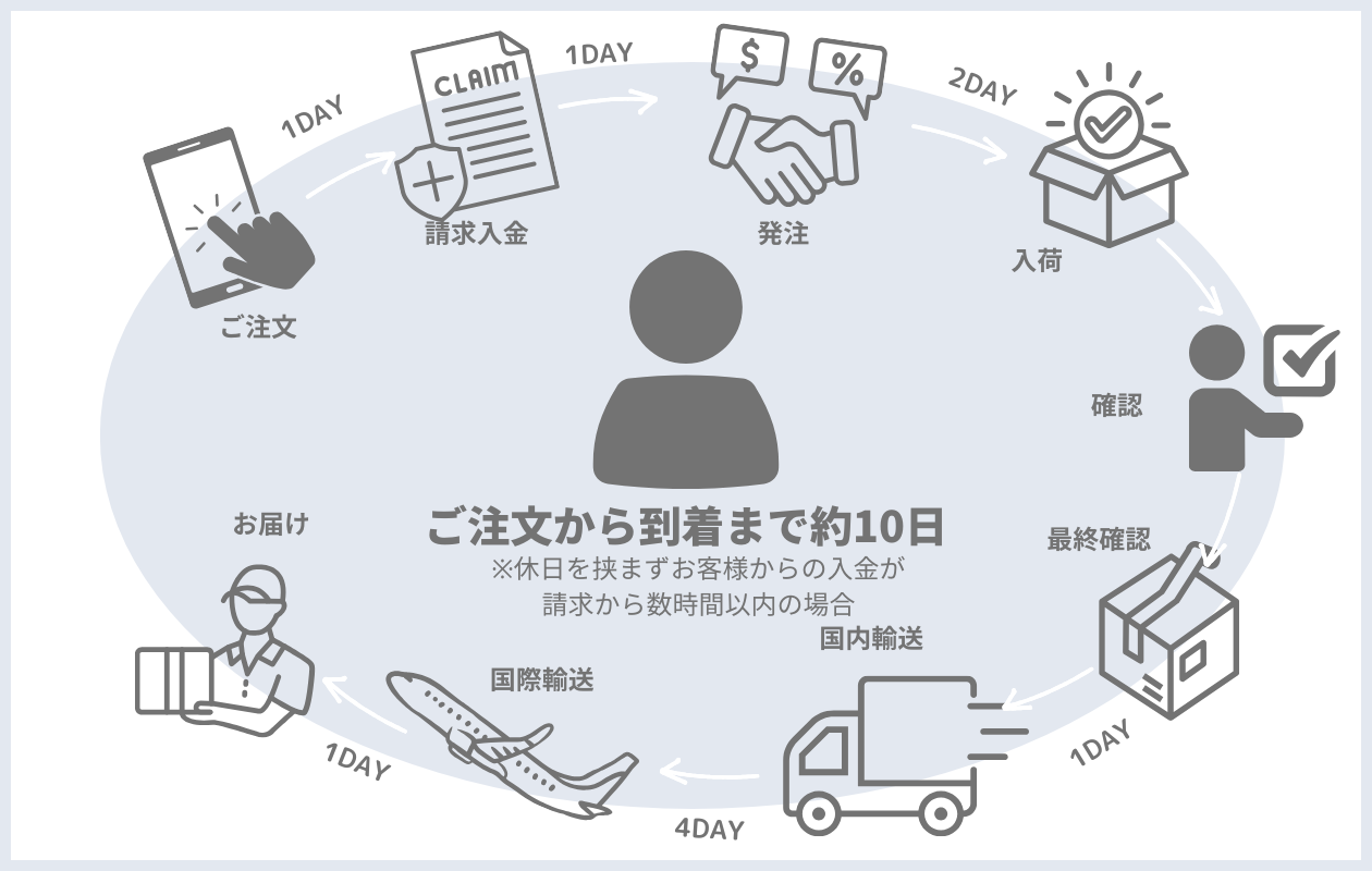 注文 → 請求 → 入金 → 発注 → 倉庫到着 → 出荷依頼 → 韓国出発