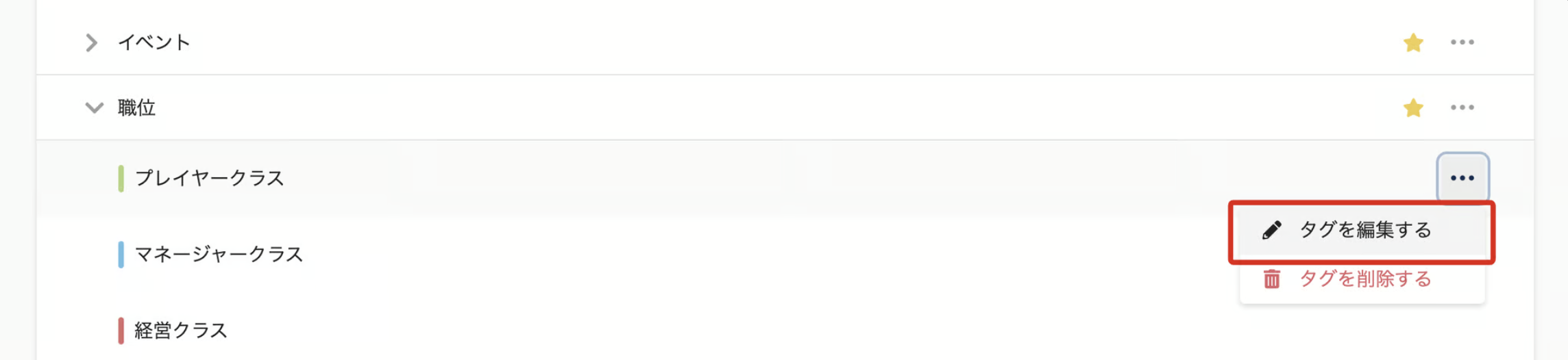 編集したいタグの横の「…」の「タグを編集する」をクリックし、タグ名とタグの色とタグに関する説明(任意)を編集する
