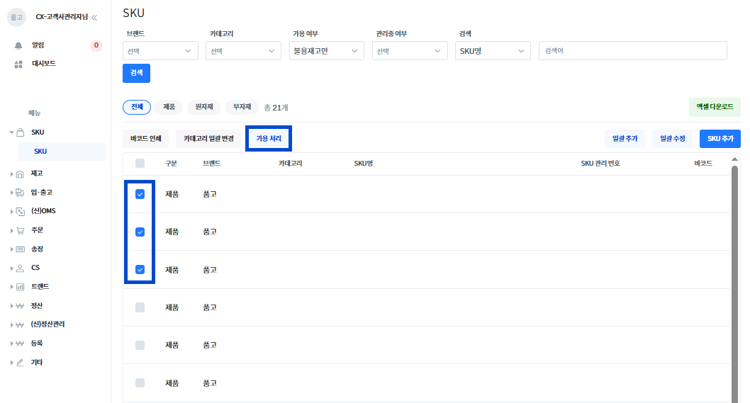 2. 원하는 SKU를 체크 후 [가용 처리] 버튼을 눌러 주세요.