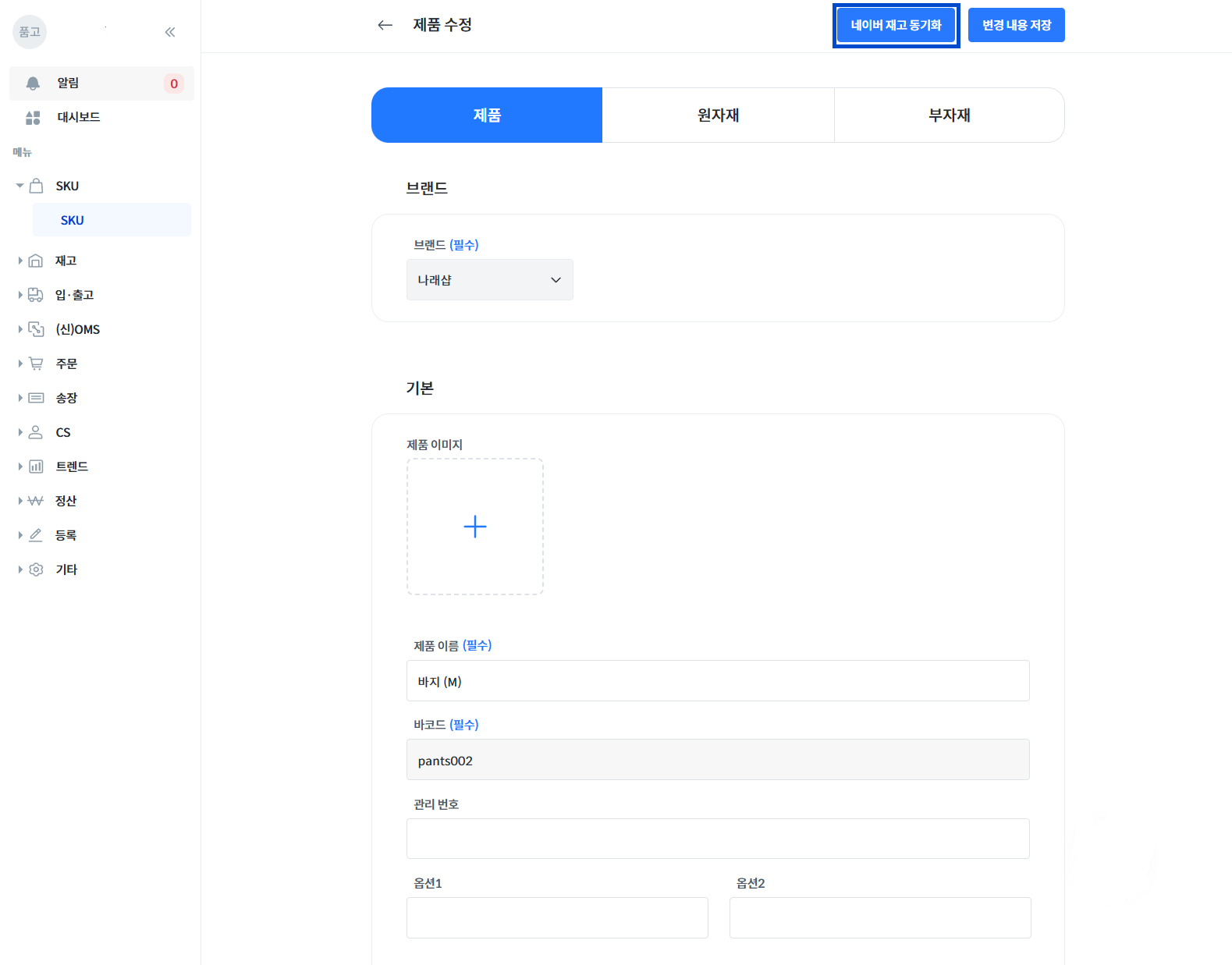 SKU명과 바코드는 필수 정보입니다. 이 외 정보는 내부적으로 필요한 경우 선택해 주세요.