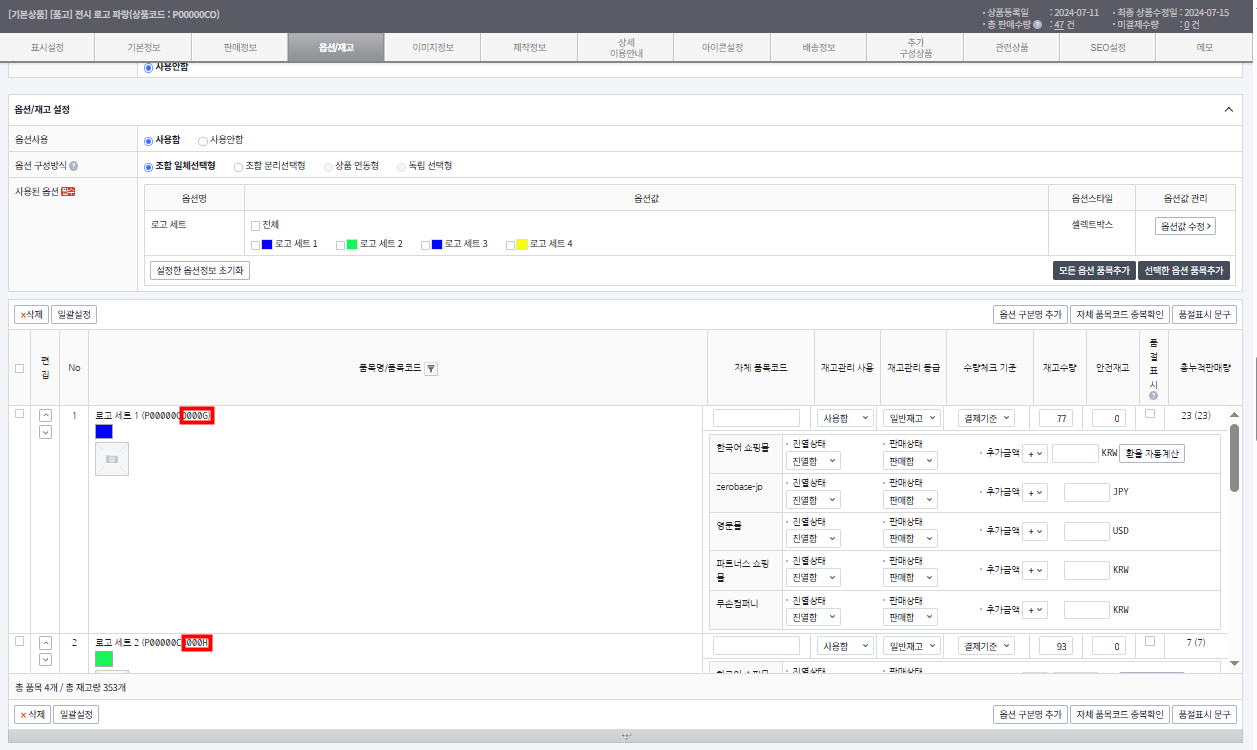 예시) 아래 이미지 기준으로 상품 옵션명은 로고 세트=로고 세트 1, 로고 세트=로고 세트 2... 형식으로 입력 필요
