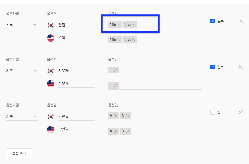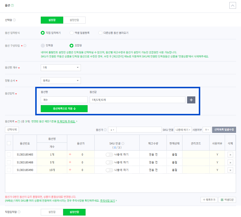 상품 옵션명: 스마트스토어 내 옵션명: 옵션값