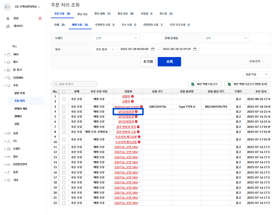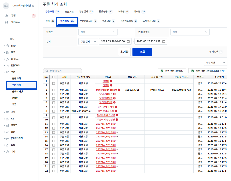 품고나우 좌측 [주문 → 주문 처리 → 주문 오류 → 매핑 오류]를 클릭 후 [조회]를 눌러주세요.