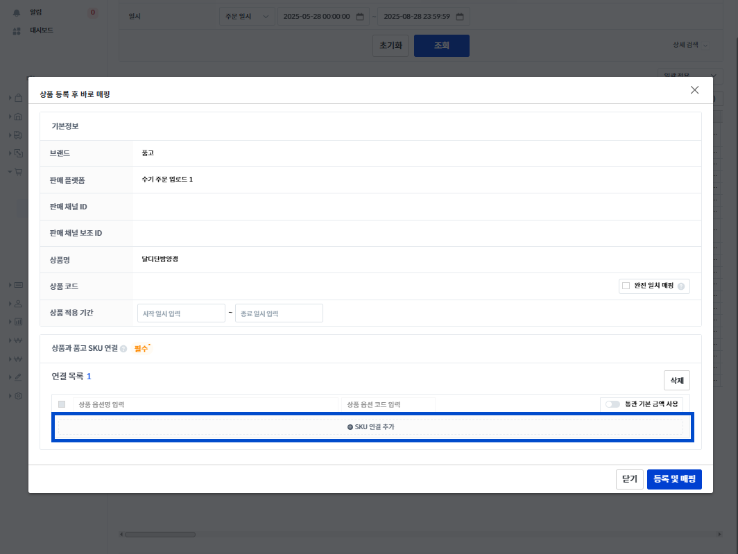 [상품 등록 후 바로 매핑] 팝업이 뜨면 [SKU 연결 추가] 버튼을 눌러 출고되어야할 품목을 설정해 줍니다.