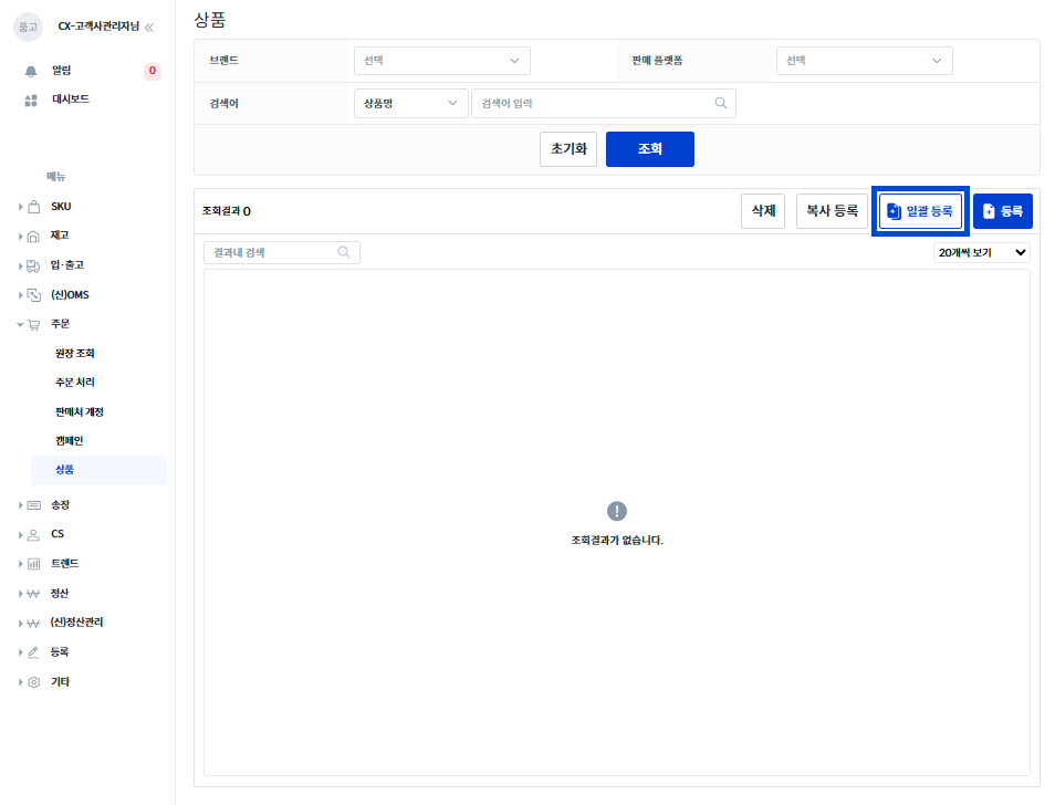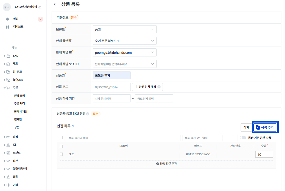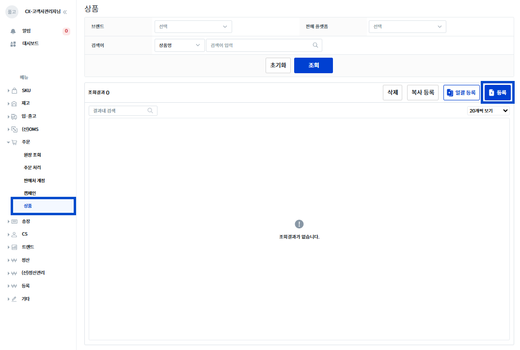 품고나우 좌측의 [주문 → 상품]으로 접속하여 [등록] 버튼을 눌러주세요.