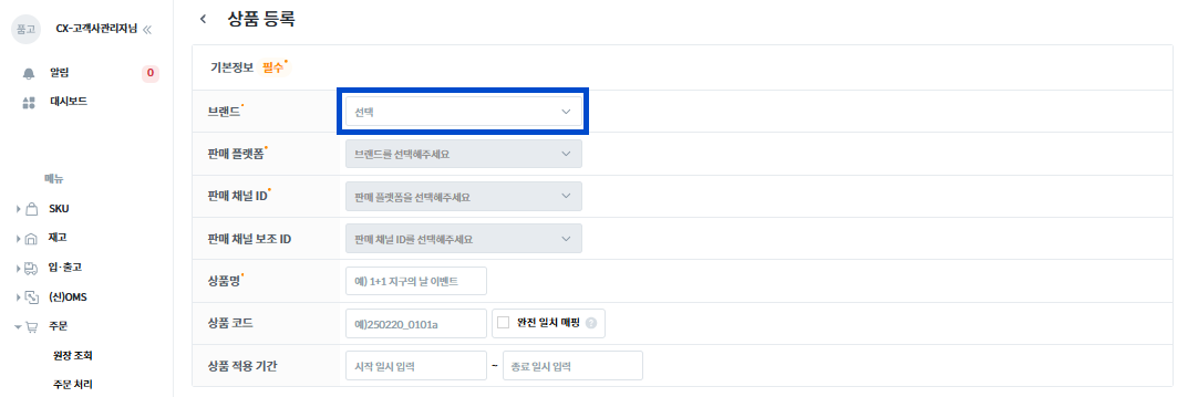 기본정보의 [브랜드]를 선택 후 [판매 플랫폼], [판매 채널 ID]를 선택해 주세요.