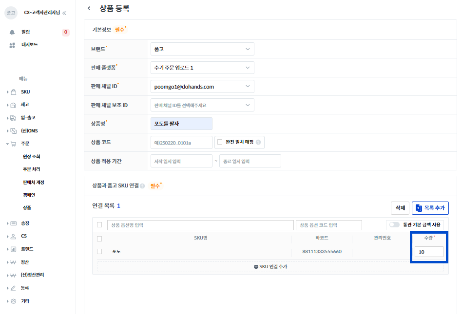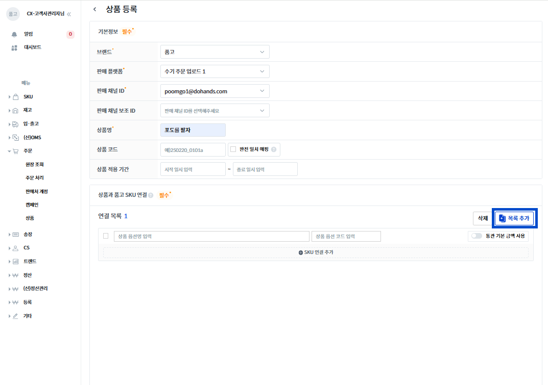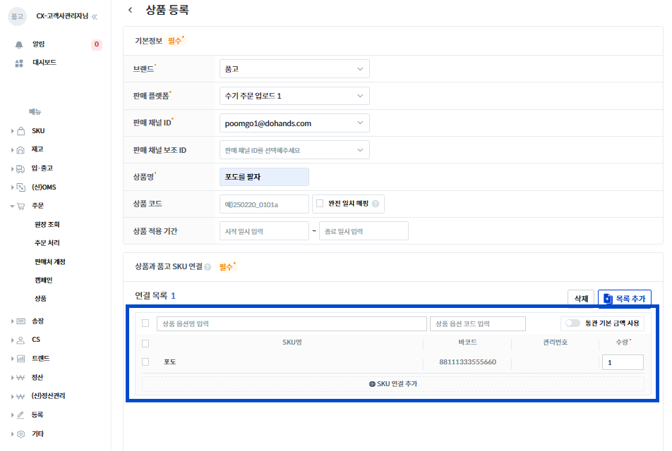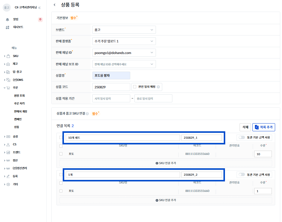 연결 목록에 2개 이상의 SKU가 있을 때는 [상품 옵션명]과 [상품 옵션 코드]를 반드시 입력해야 합니다.