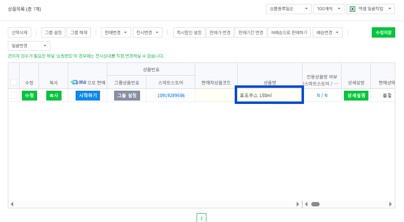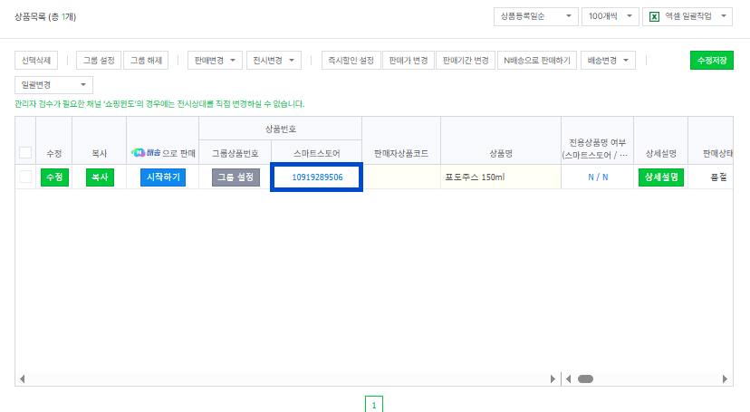 상품 코드: 스마트스토어에 등록된 상품 번호