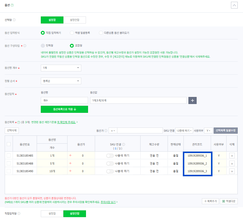 예시) 아래 이미지 기준으로 상품 옵션 코드는 각각 10919289506_1, 10919289506_2, 10919289506_3
