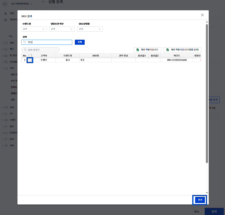 원하는 품목을 선택 후 [추가]를 누르면 해당 품목이 상품의 연결 목록에 추가됩니다.