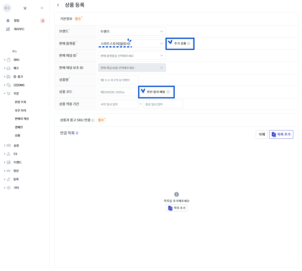 상품 등록 시 [판매 플랫폼]이 스마트스토어(물류사)일 때만 추가 상품이 뜨게 됩니다.