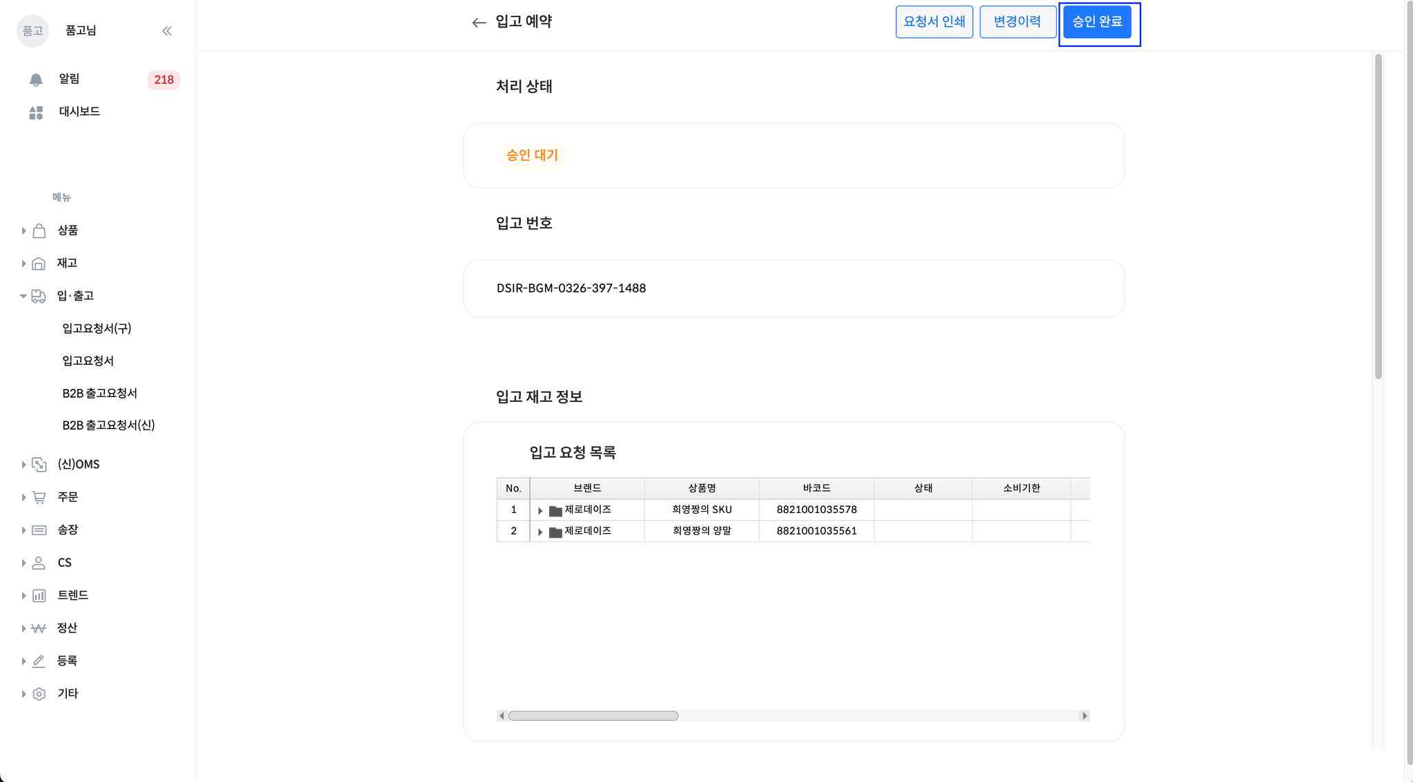 입고요청서와 실제 입고한 품목의 수량, 바코드, 유통기한이 일치하지 않을 때 [승인 대기] 상태가 됩니다.