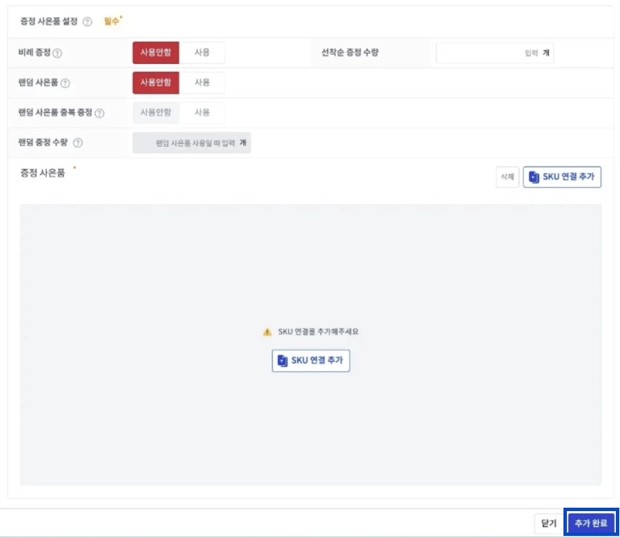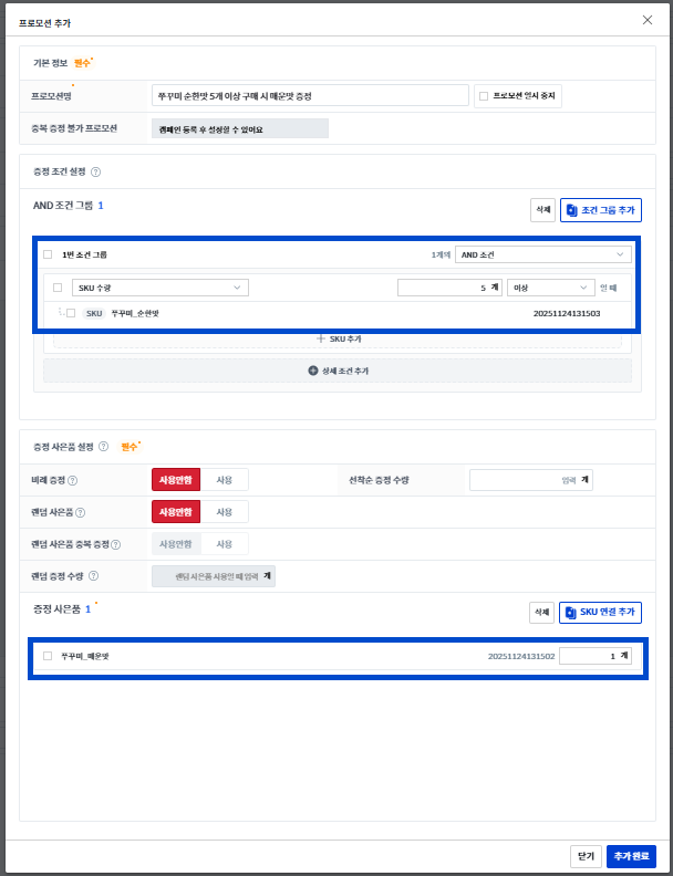 프로모션 조건 그룹에 [SKU 수량]을 선택하는 경우, 주문 내 해당 SKU가 설정한 수량만큼 포함되어있다면 [증정 사은품]이 제공됩니다.