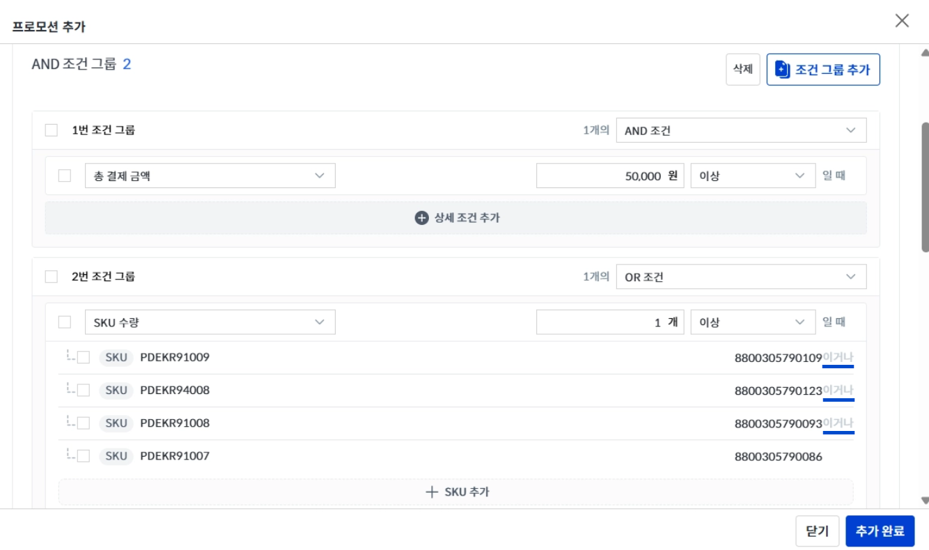 OR 조건 | 그룹 내 추가하는 조건이 하나라도 부합하면 프로모션이 적용됩니다. | |
