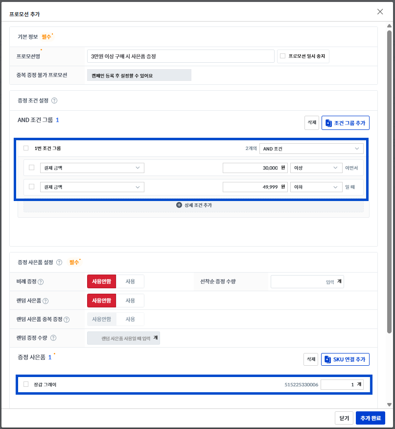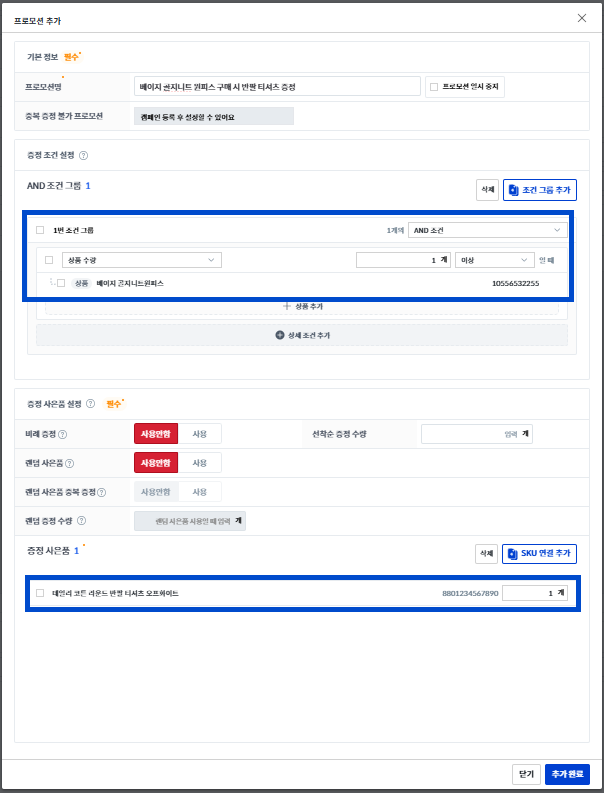 프로모션은 설정하신 조건에 따라 증정되도록 여러 조건을 추가할 수 있으며, 여러 개의 조건에 맞추어 부합하는 주문 건에는 자동으로 설정한 품목이 사은품으로 증정됩니다.