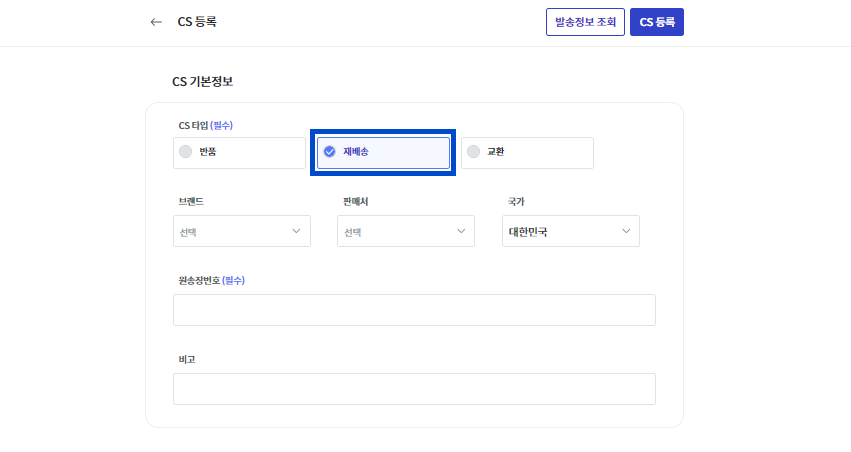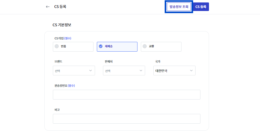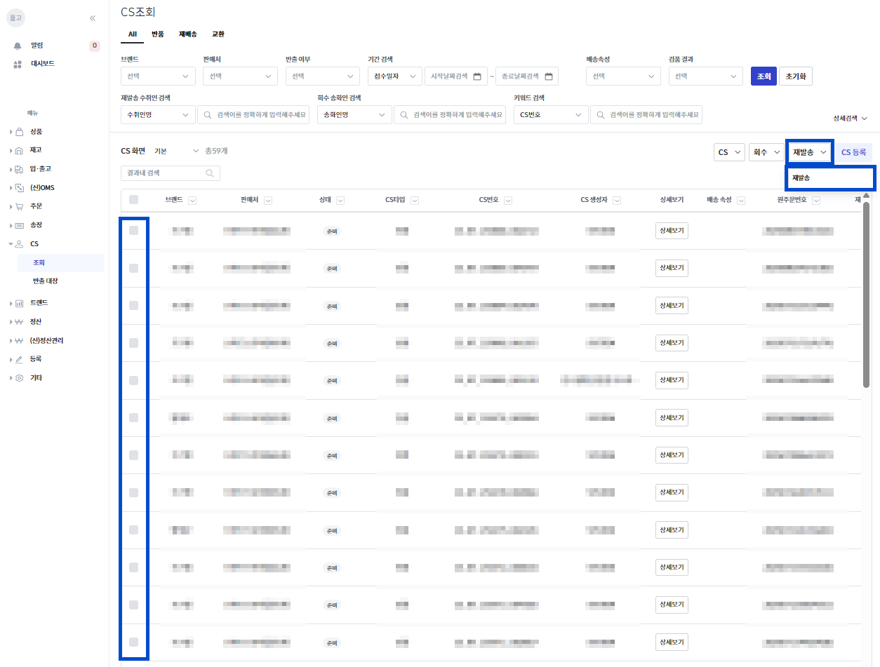 재발송 → 등록한 CS 1건에서 재발송 요청만 가능