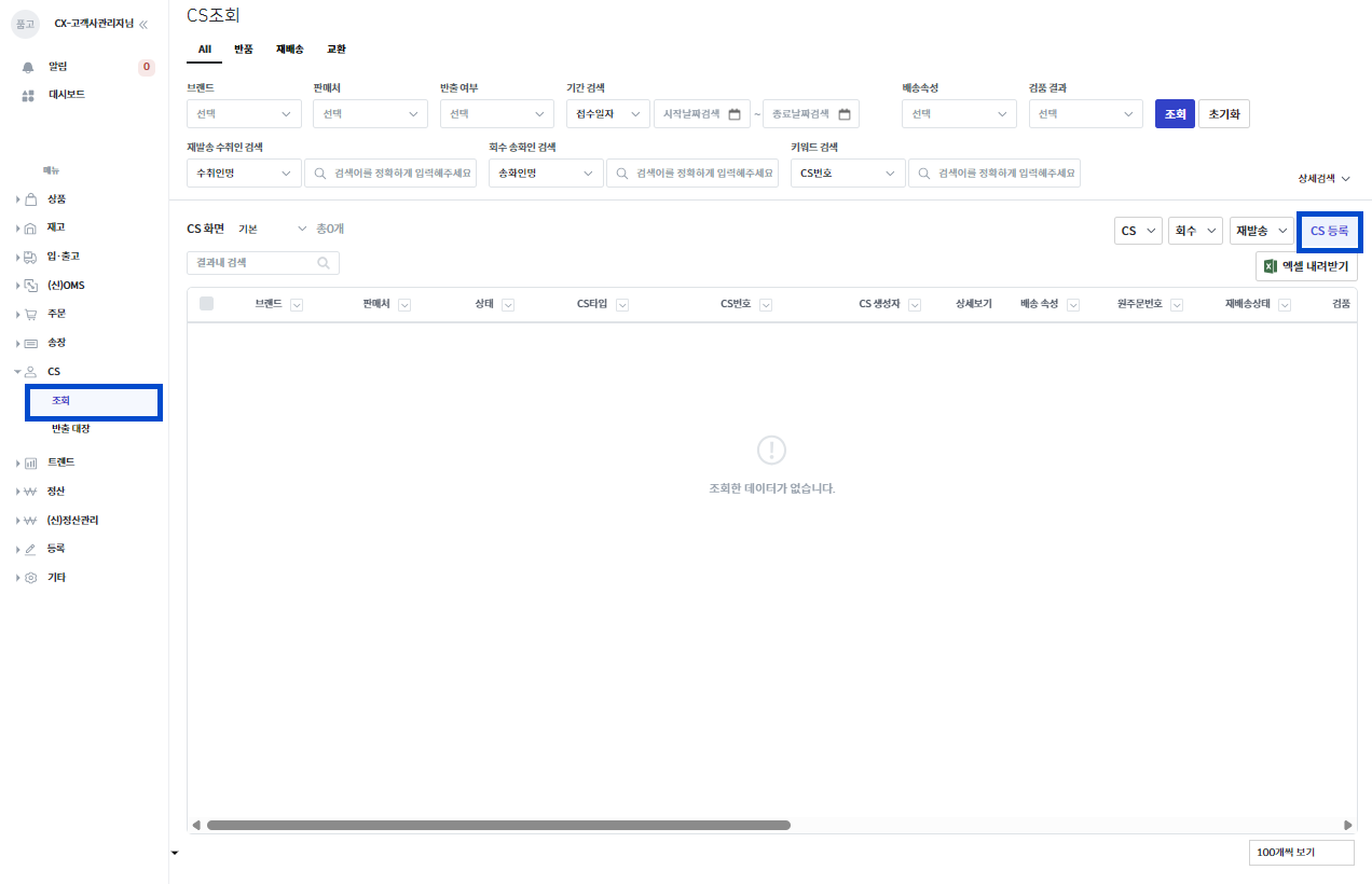 품고나우 좌측 [CS → 조회]로 접속하여 [CS 등록] 버튼을 클릭해 주세요.