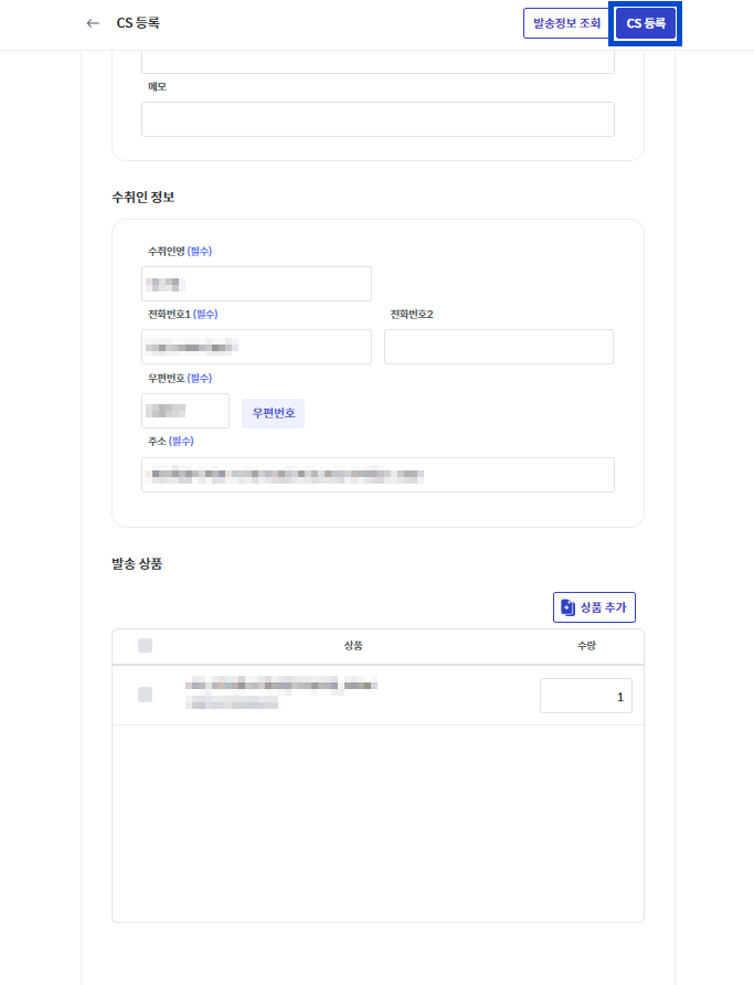 CS 등록만으로는 회수와 재발송이 진행되지 않습니다.