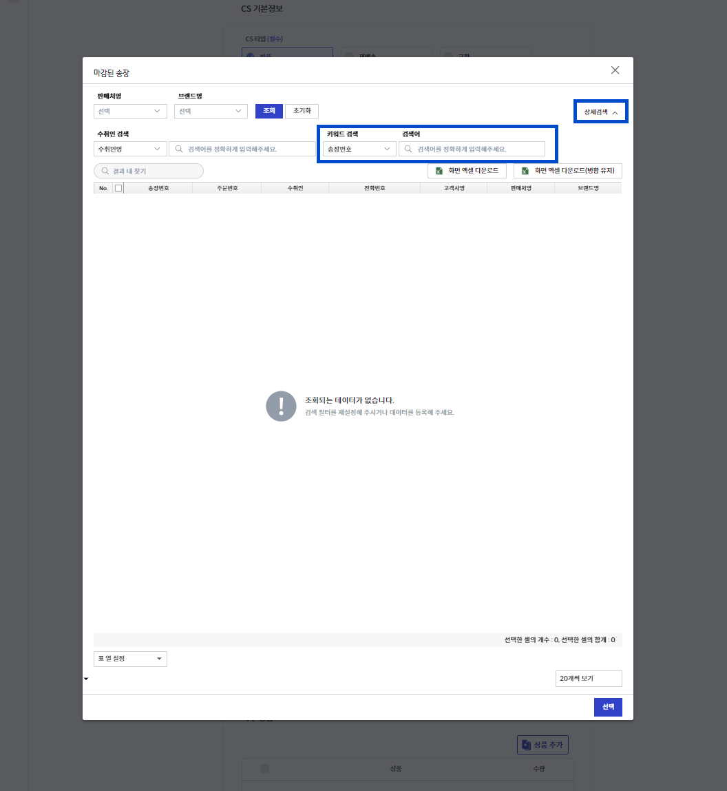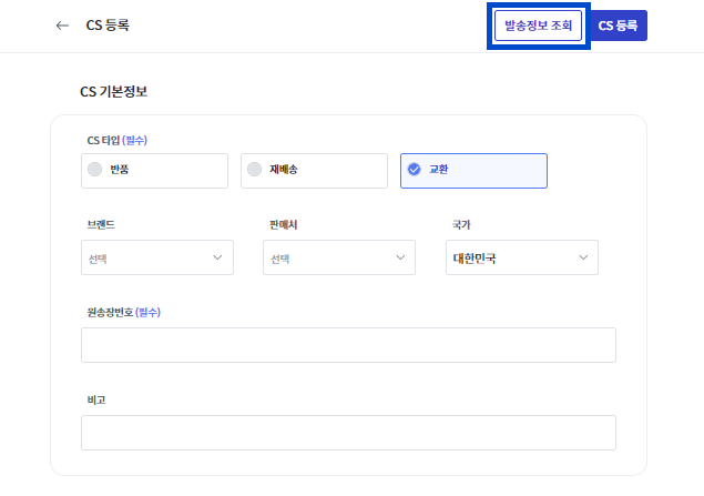 CS 등록창 상단의 [발송 정보 조회]를 눌러주세요.