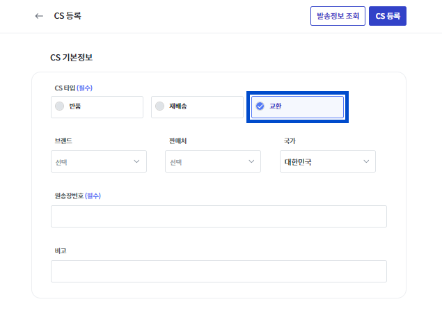 CS 타입이 [교환]인 경우, CS 1건당 회수 요청 1회와 재발송 요청 1회를 모두 진행할 수 있습니다.