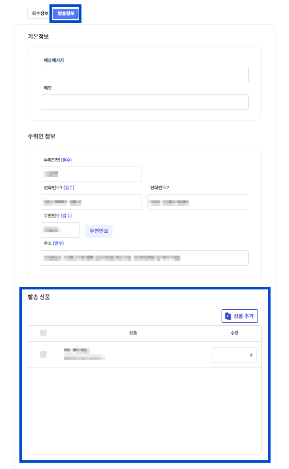 수정이 필요하다면 [상품 추가]를 눌러 재발송 되어야 할 품목을 설정하고, 기존 품목을 체크하여 삭제해 주세요.