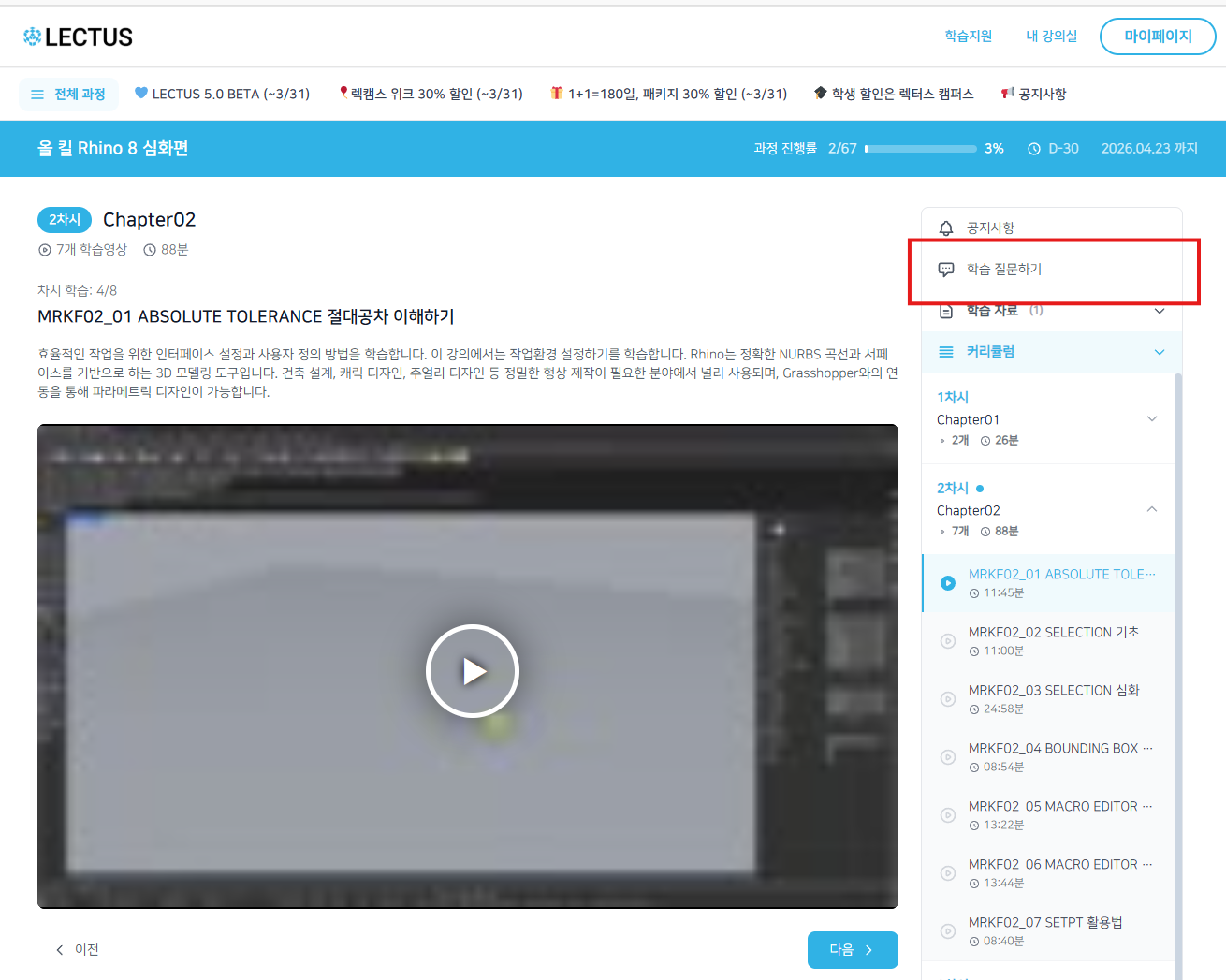 학습 영상 시청 중 궁금한 점이 있으실 경우, [학습 영상 수강 페이지] 내 [학습 질문하기] 게시판을 이용해 주시기 바랍니다. 강사님으로부터 직접 상세한 피드백을 받아보실 수 있습니다.