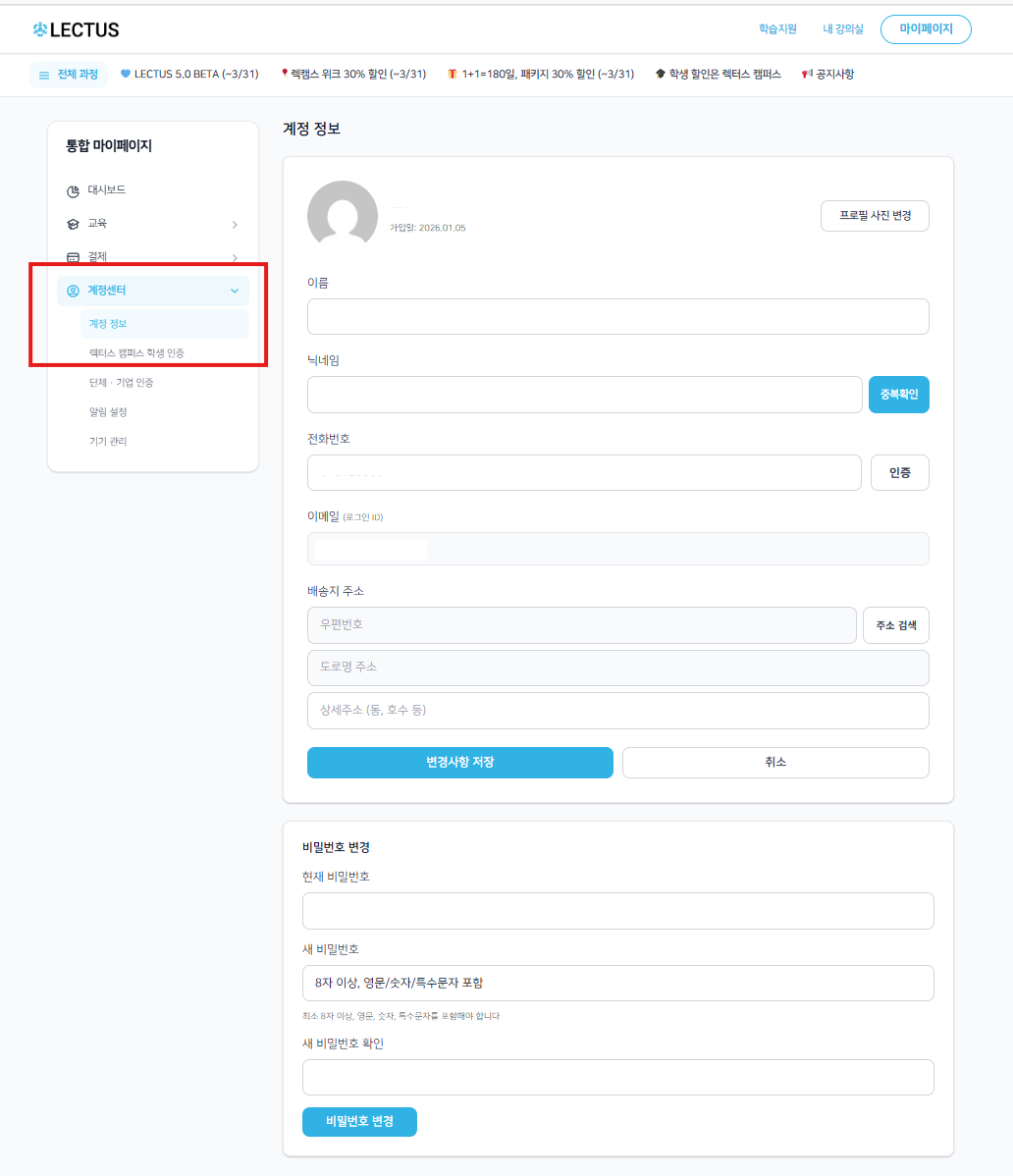 정보 변경: 페이지 좌측의 [계정센터] 메뉴를 클릭하신 뒤, 수정하실 내용을 입력하고 [변경사항 저장] 버튼을 클릭해 주시면 완료됩니다.