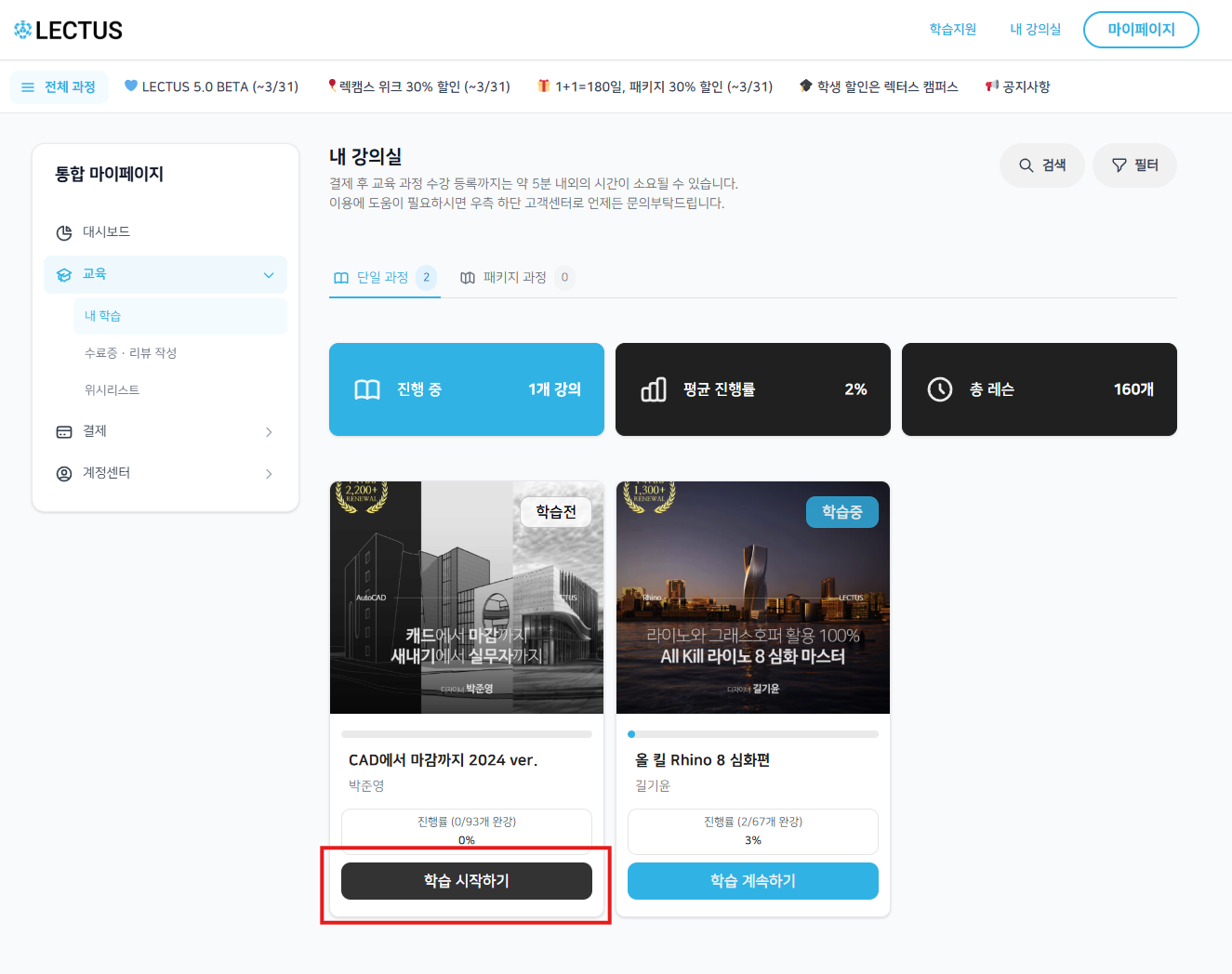 LECTUS의 모든 강의는 결제 완료 즉시 수강 권한이 부여되어 바로 학습을 시작하실 수 있습니다. 단, 결제 완료와 동시에 수강 기간 차감도 시작되오니 이 점 유의해 주시기 바랍니다.