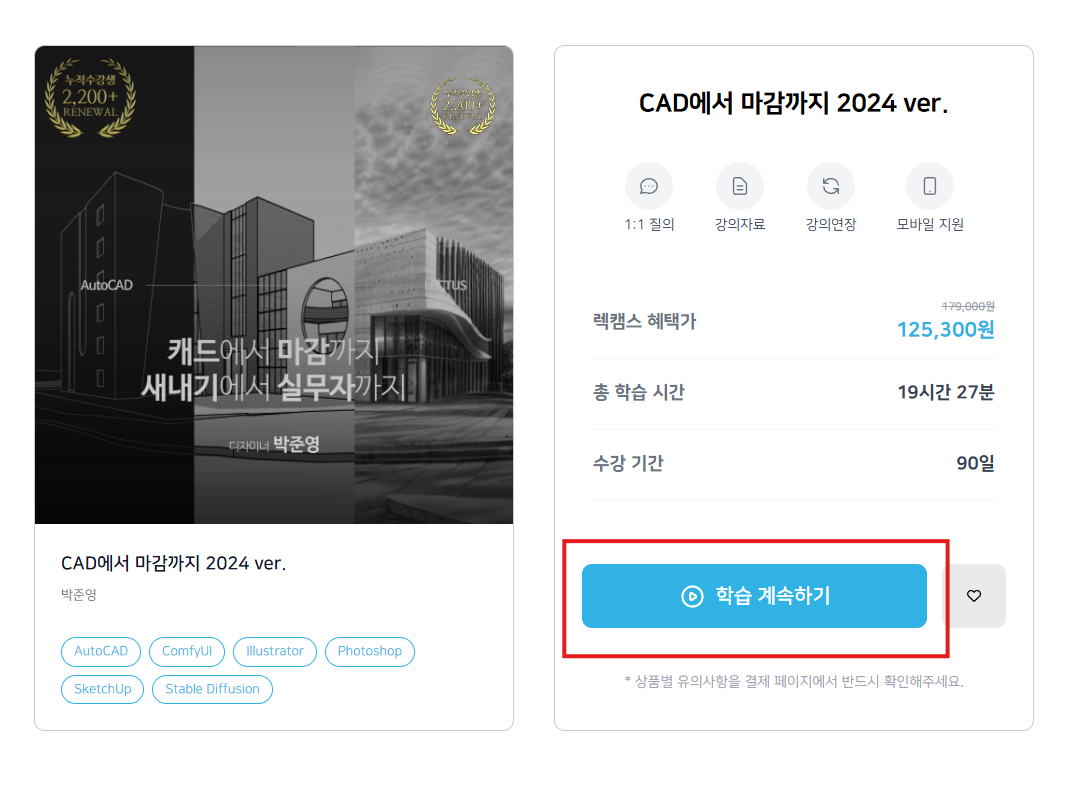 메인 페이지 이용: 홈페이지 메인에서 구매하신 교육과정 클릭 > 과정 상세 페이지 내 [학습 시작하기] 클릭
