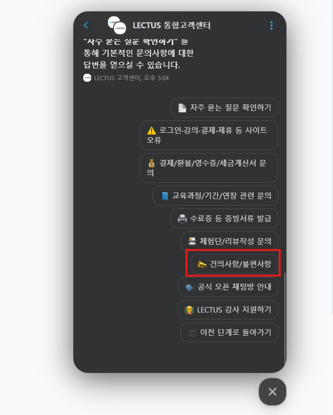 해결 방법: 만약 20분이 경과한 후에도 강의가 확인되지 않는다면, 화면 우측 하단의 [고객센터] > [LECTUS.KR│교육·홈페이지] > [건의 사항/불편 사항 접수] 경로를 통해 문의해 주시기 바랍니다. 신속하게 확인하여 안내해 드리겠습니다.