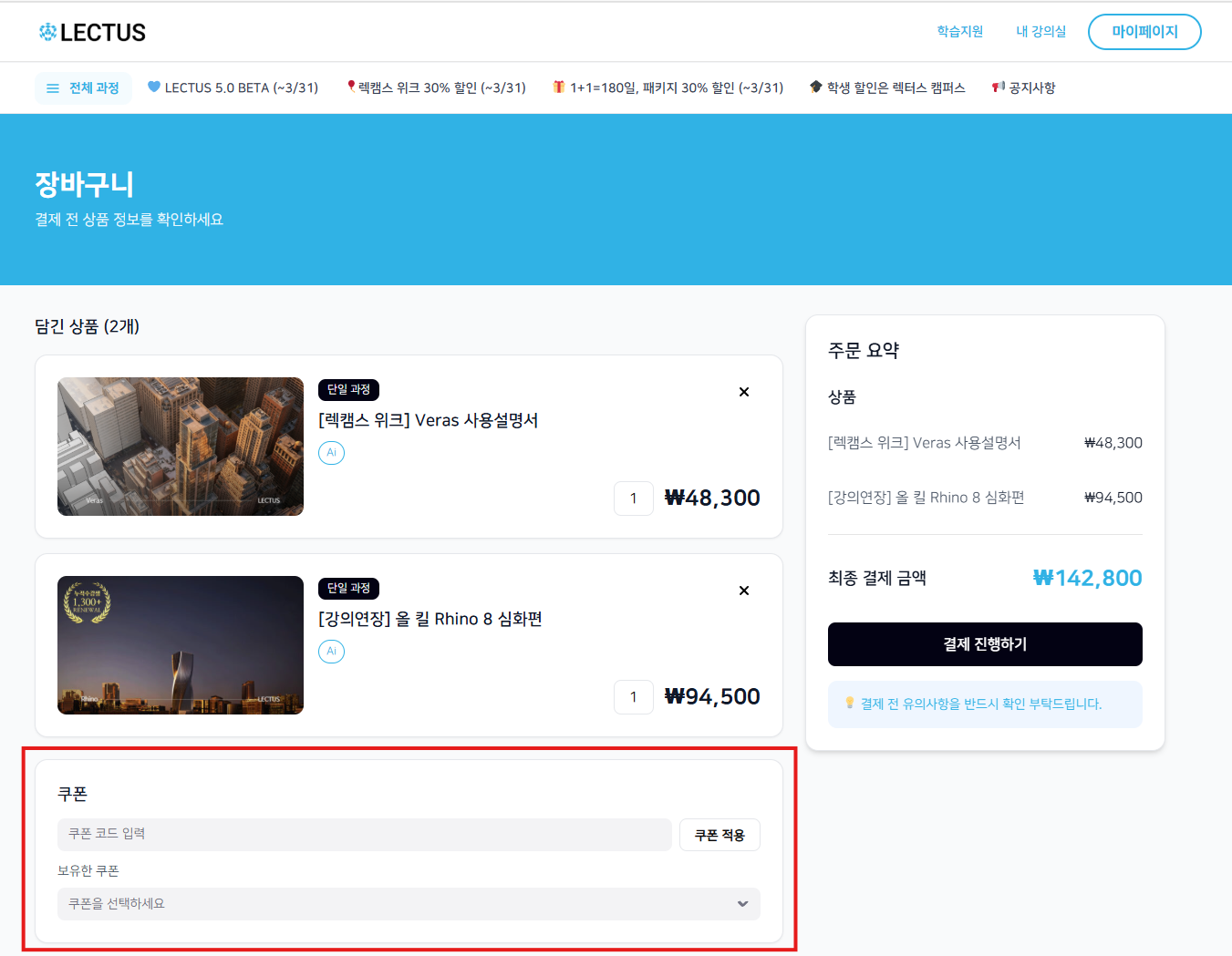 필수 유의사항 (결제 완료): 쿠폰을 적용하셨더라도 우측의 [결제 진행하기] 버튼을 클릭하여 결제 단계를 끝까지 완료하셔야만 정상적으로 사용 처리됩니다. 진행 도중 창을 닫으실 경우 쿠폰이 적용되지 않사오니 유의해 주시기 바랍니다.