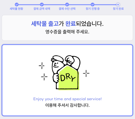 의류 배출이 모두 완료되었는지 키오스크 화면에서 상태를 꼭 확인해 주세요