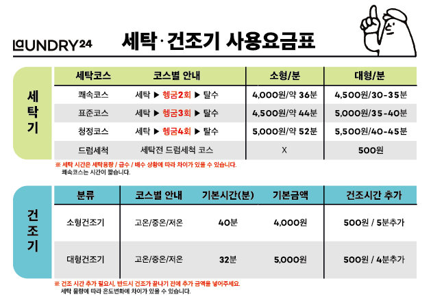 세탁기/건조기의 시간별 이용 금액이 많이 궁금하셨죠? 🤔한눈에 보기 쉽도록 보여드릴게요!! (기본 시간 및 기본 요금)주의사항 은 놓치지 마세요!매장 별로 이용 요금이 상이할 수 있어요! 키오스크 또는 매장 내 가격표를 꼭 확인해 주세요!!