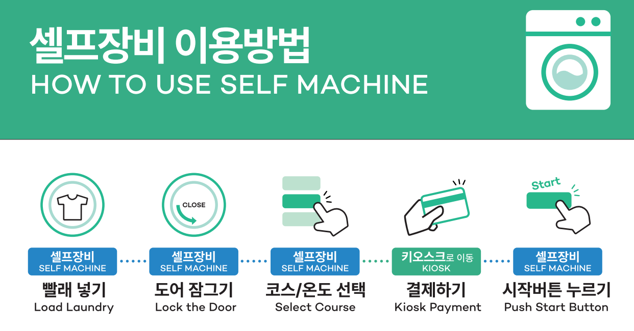 ① 세탁기는 키오스크에서 결제한 코스로 장비에서 한번 더 설정 후 시작 버튼을 눌러주세요.