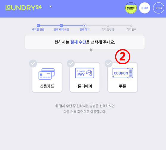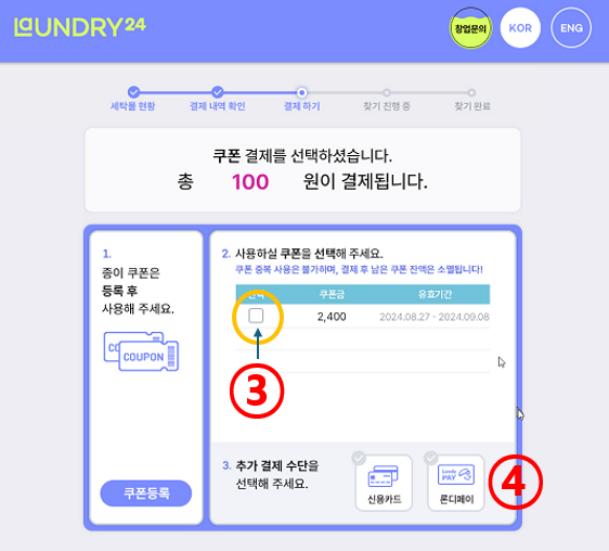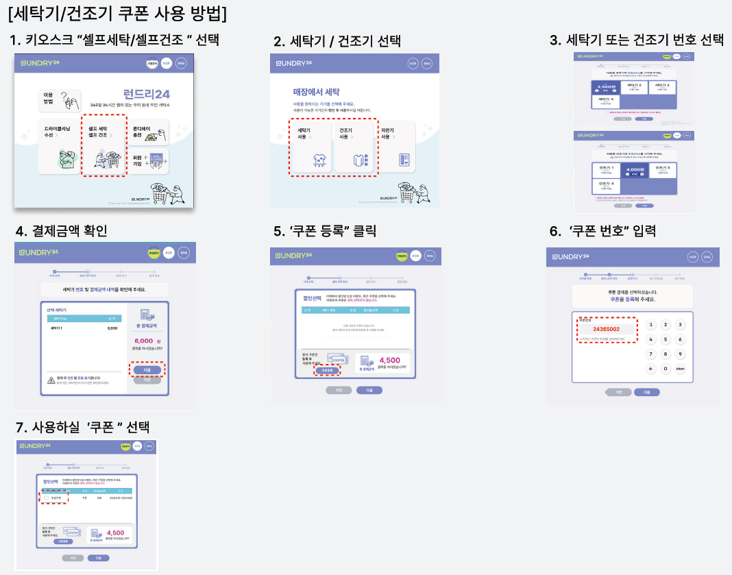셀프세탁/셀프건조 선택 > 세탁기/건조기 선택 > 세탁기 또는 건조기 번호 선택 > 결제 금액 확인 후 다음 > 하단의 "쿠폰 등록" 선택 > 쿠폰 번호 입력 > 사용하실 쿠폰 선택