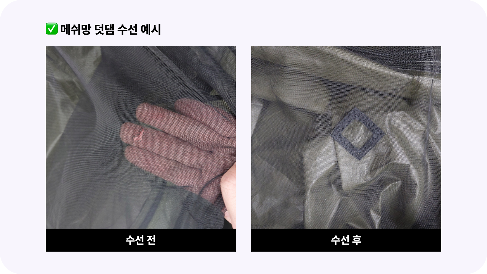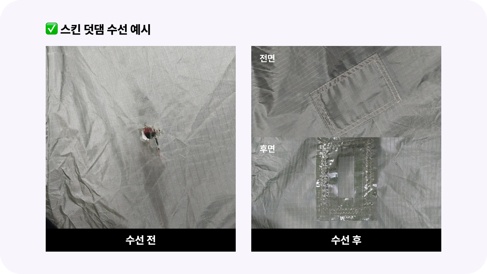 텐트의 소재 특성상 수선 부위가 완전히 원래 상태와 같아 보이기는 어려울 수 있습니다. 수선은 견고함과 내구성을 우선으로 진행되며, 그로 인해 외관상 티가 날 수 있습니다.