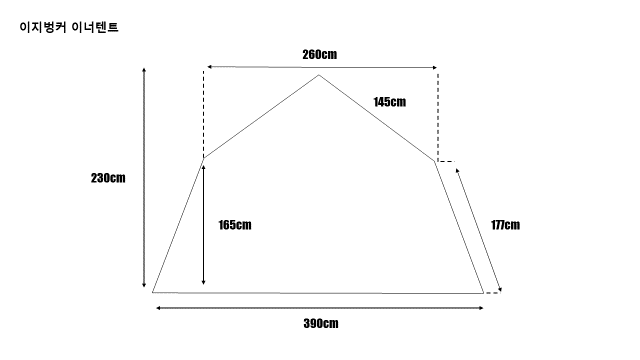 이너텐트 : 2.6m (짧은변) * 3.9m(긴변) * 1.65~2.3m(깊이) * 2m(높이)