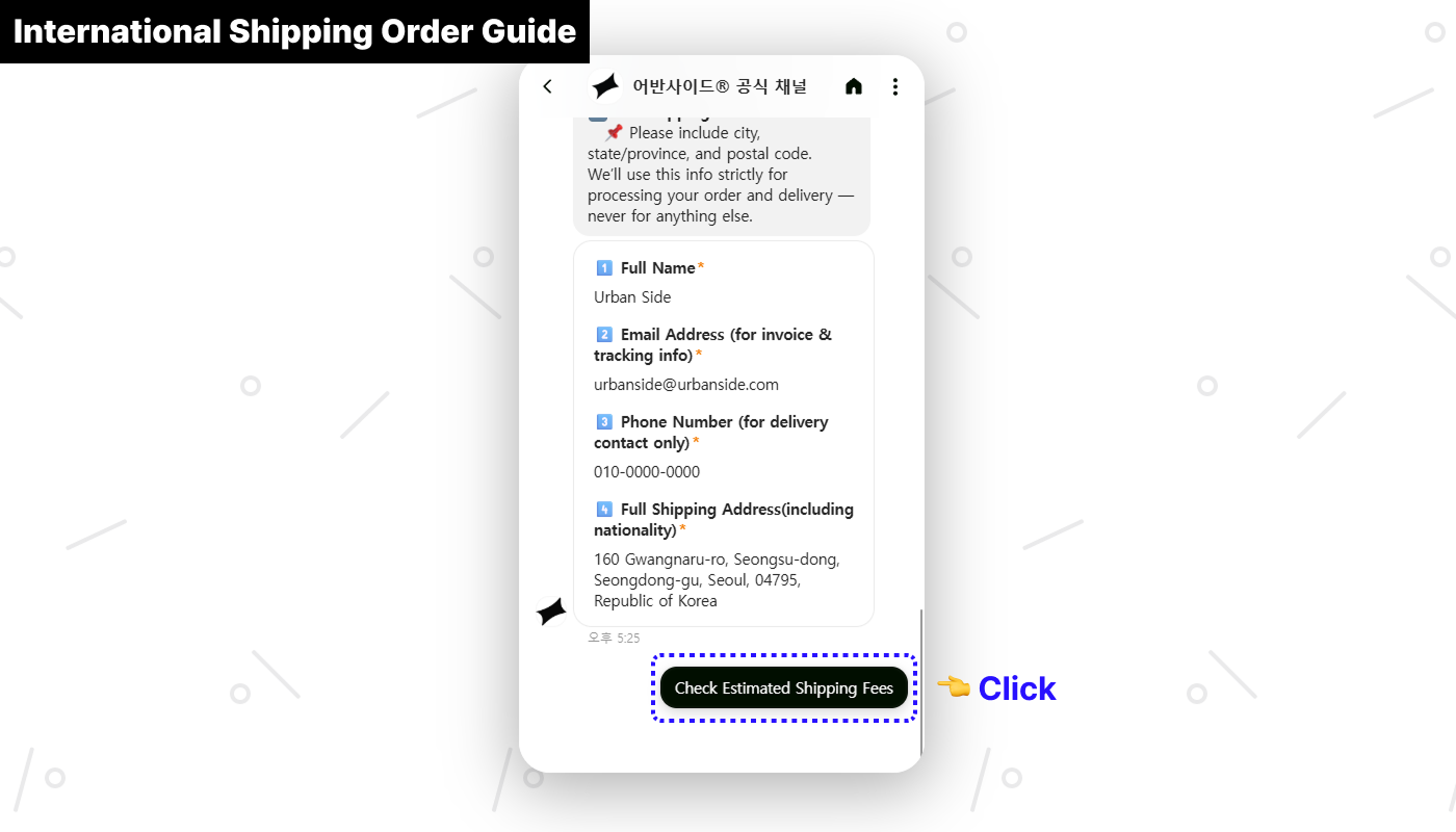 작성 후 저장(Save) → Check Estimated Shipping Fees 버튼을 눌러주세요.
