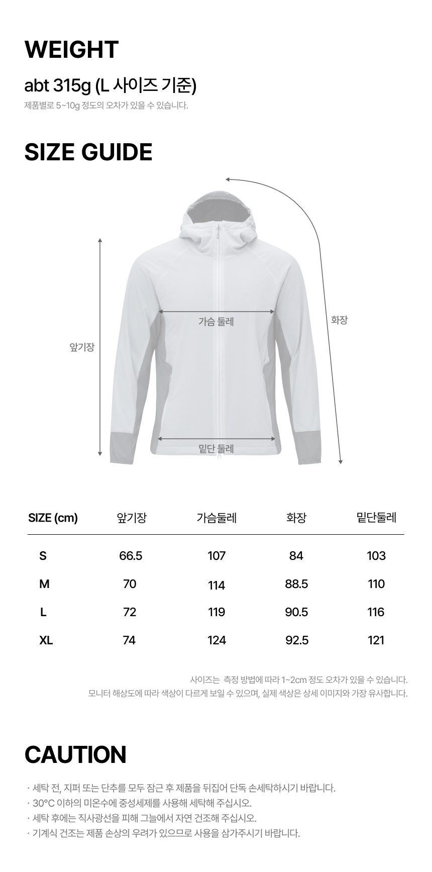 경량 구조 (315g) → 쉘 재킷의 외형과 미들레이어의 기능을 동시에 수행