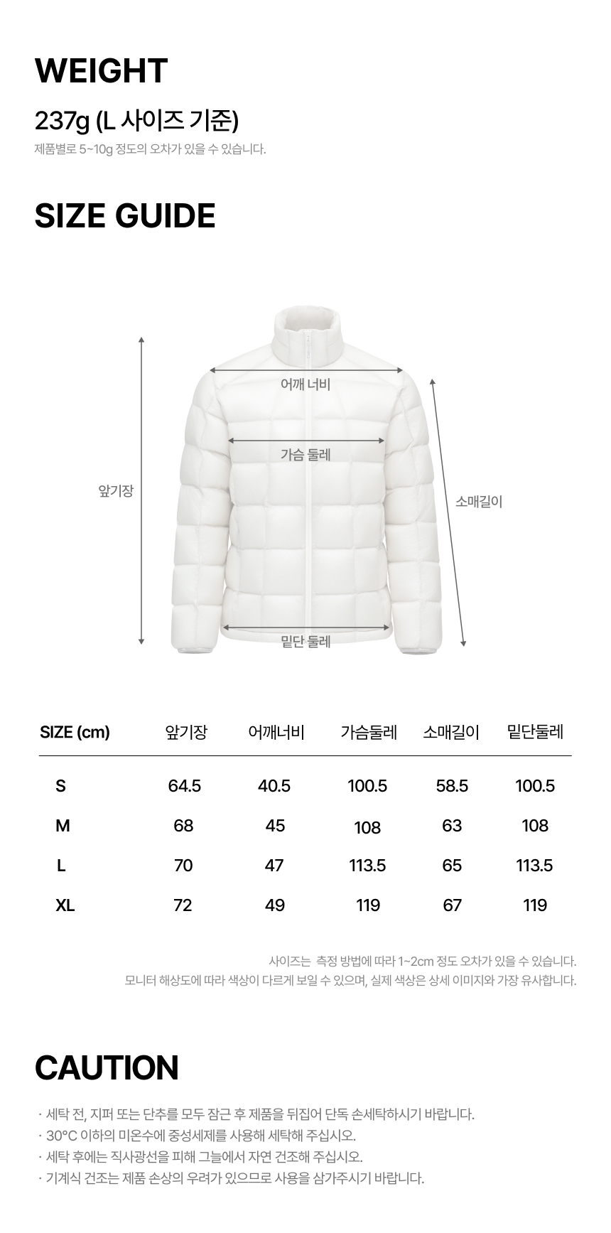 물세탁 | 저온 단독 세탁, 다운 전용 세제 사용 |