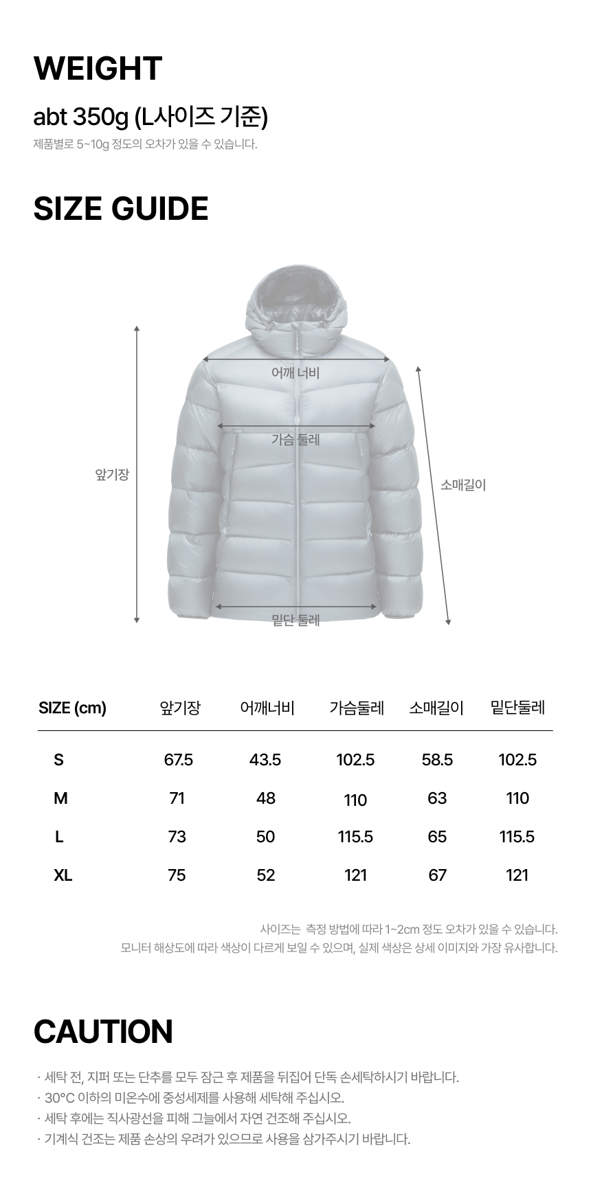 물세탁 | 저온 단독 세탁, 다운 전용 세제 사용 |