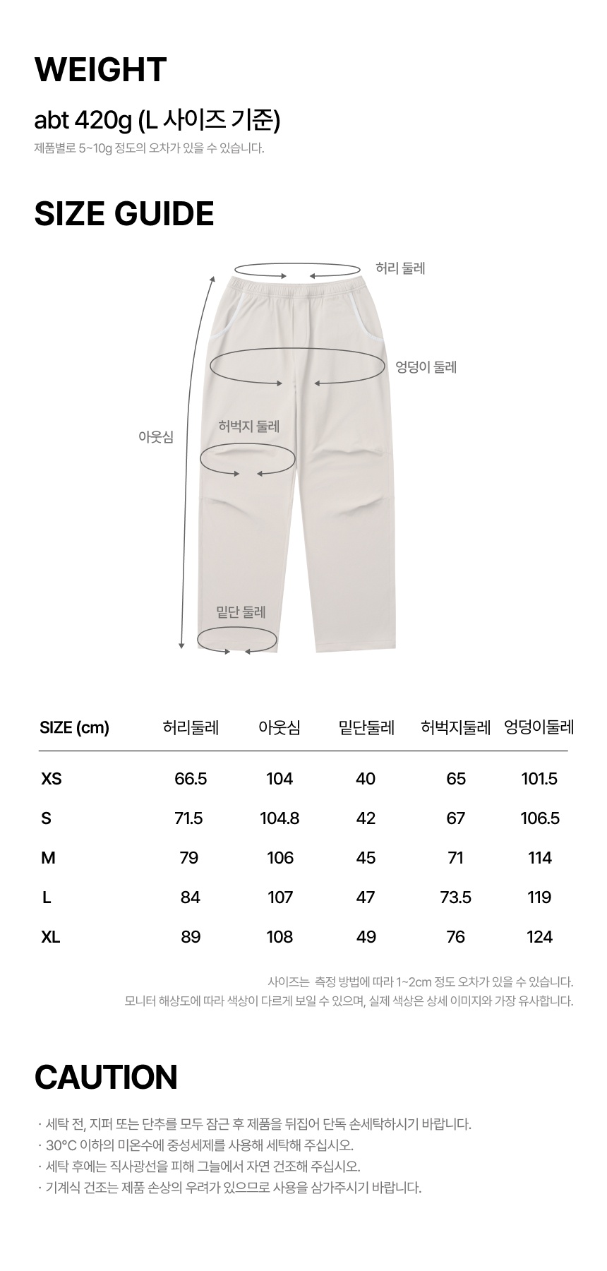 SIZE(cm) | 허리둘레 | 아웃심(전체길이) | 밑단둘레 | 허벅지둘레 | 엉덩이둘레 |