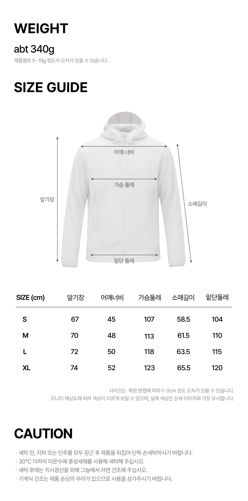 SIZE(cm) | 총장(앞기장) | 어깨너비 | 가슴둘레 | 소매 | 밑단둘레 |
