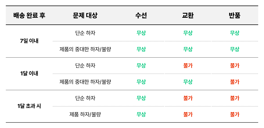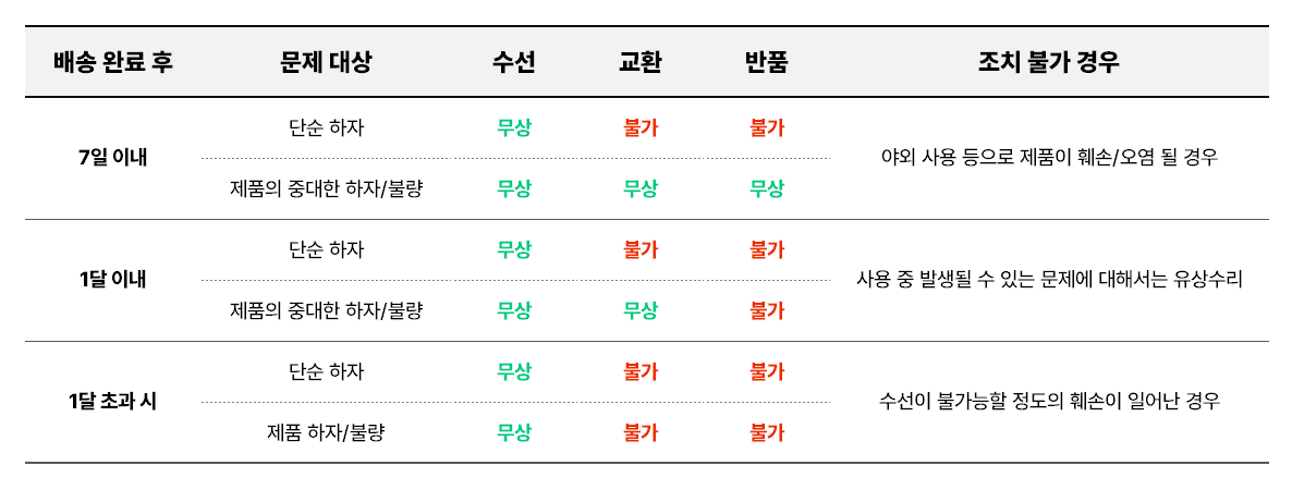 • 가능한 경우 수선 우선, 수선이 어렵다면 동일 제품 교환, 최종적으로 환불이 이루어집니다.