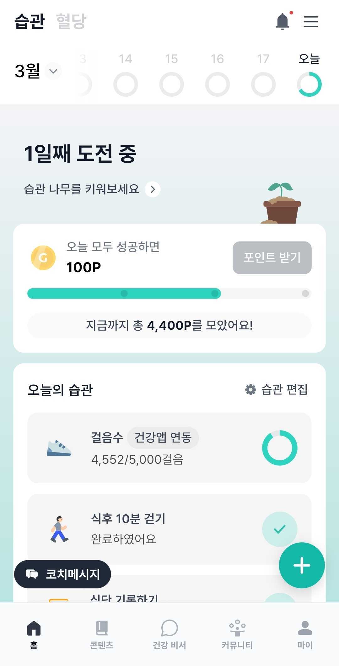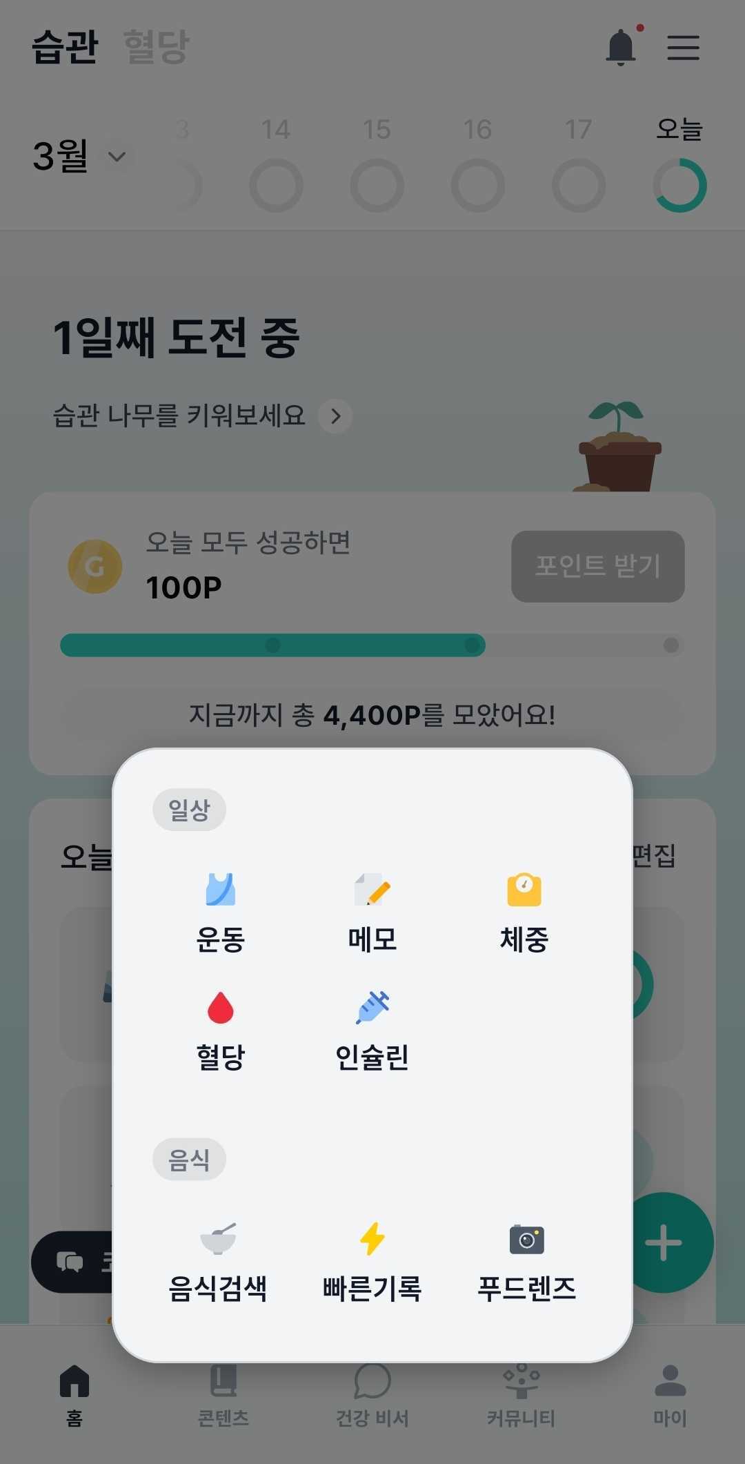 먼저 글루코핏 앱 홈 화면 오른쪽 아래에 있는 동그란 (+) 버튼을 눌러주세요.