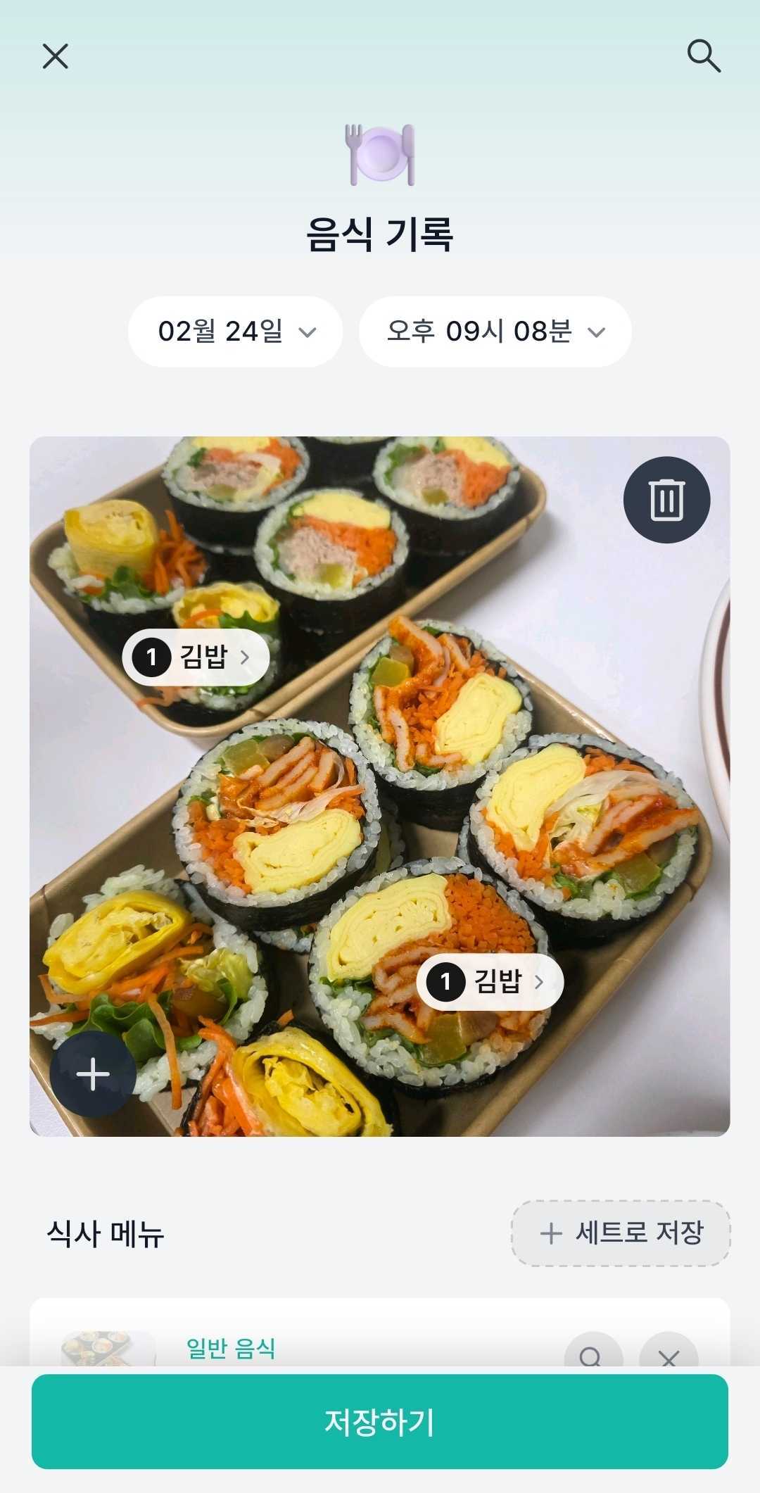 분석이 완료되면 음식 기록 화면이 나타납니다. 인식된 메뉴가 맞는지 확인하고, 화면 아래의 '저장하기' 버튼을 누르면 식단 기록 끝!