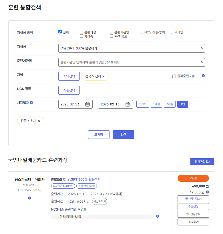 예) 검색어 : ChatGPT 300% 활용하기 , 훈련기관명 : 팀스파르타