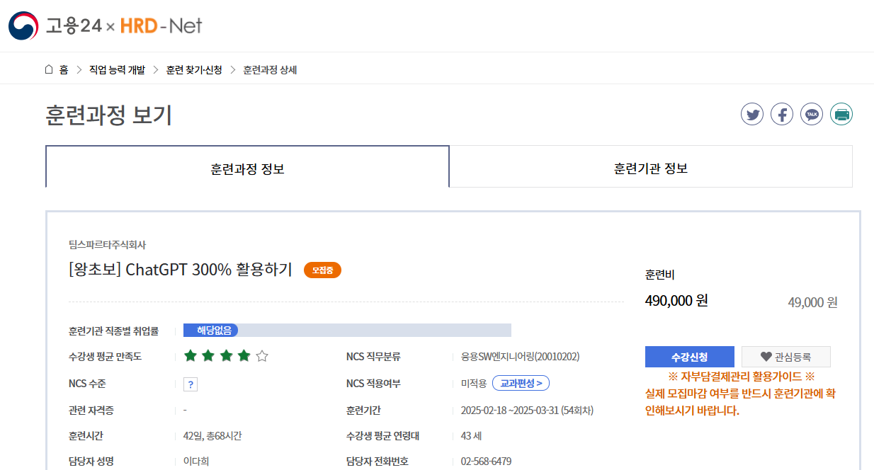 결제가 완료 후, 고용24로 접속해주셔서 결제하신 국비지원 강의의 수강을 신청해주셔야 해요.